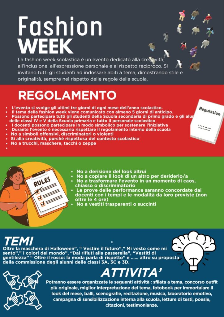 Nei giorni 29, 30 e 31 ottobre, la nostra scuola si è trasformata in una vera e propria Fashion Week creativa e formativa: tre giornate ricche di teatro, musica, arte, ballo, giochi educativi e tanta fantasia!